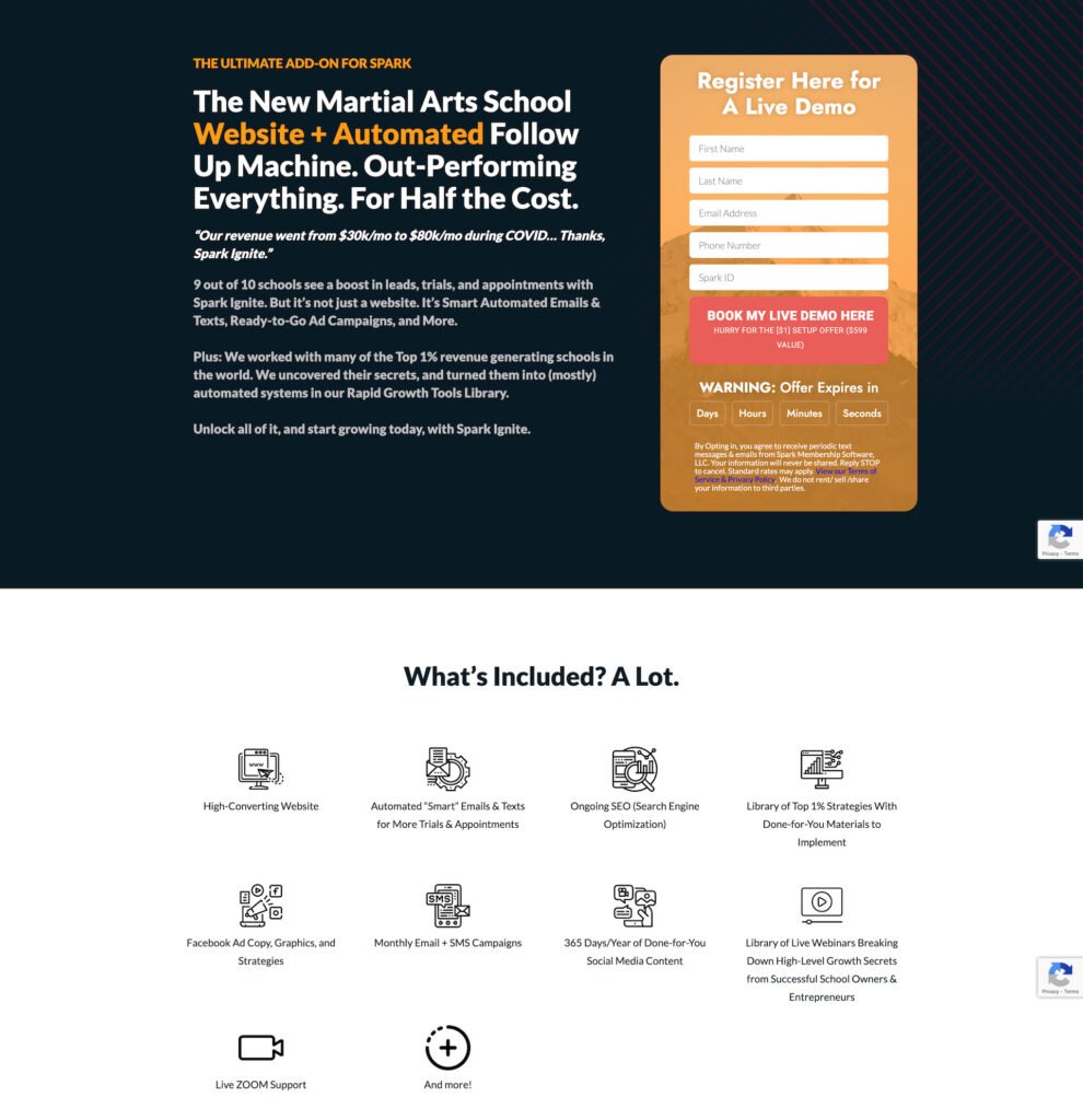 Spark Ignite is an all-in-one website and automated marketing system for martial arts schools that boosts leads, trials, and revenue—proven by top-performing schools, at half the cost.